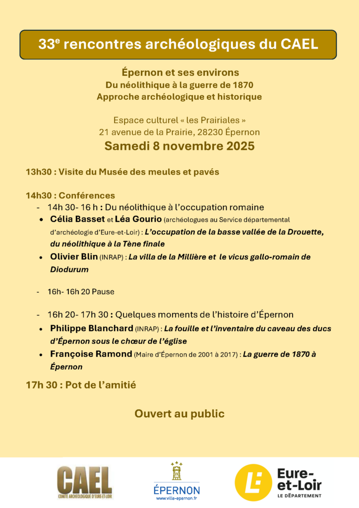 Le CAEL organise chaque année des Rencontres archéologiques autour de thématiques spécifiques ou d’actualité. Elles abordent des sujets de recherches archéologiques se rapportant à l’histoire de l’Eure-et-Loir et de ses habitants. Vous trouverez ci-dessous les liens vers les résumés des communications des intervenants de ces journées: